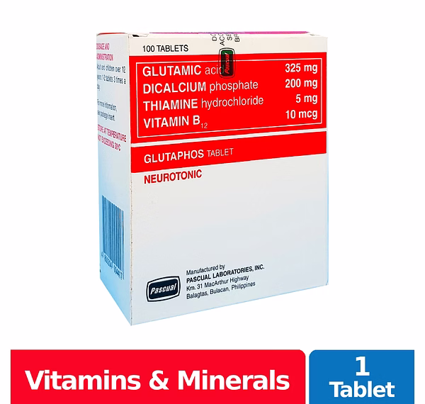 Glutaphos Tablet contains Cyanocobalamin, Dicalcium Phosphate, Glutamic Acid and Thiamine Hydrochloride as active ingredients. This medicine works by stimulating the brain's glutamate receptors; normalizing the functioning of cells, nerves, bones and muscles; treating low levels of vitamin B1; normalizing the formation of red blood cells and nerve tissues.
