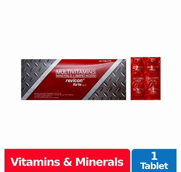 Revicon Forte Tablet is a yellow-orange, elliptical-shaped, sugar-coated tablet. This is a nutritional supplement to provide essential vitamins, minerals and amino acids for general good health, to help promote physical vigor and help improve stamina during physical activity.