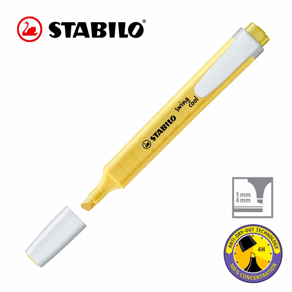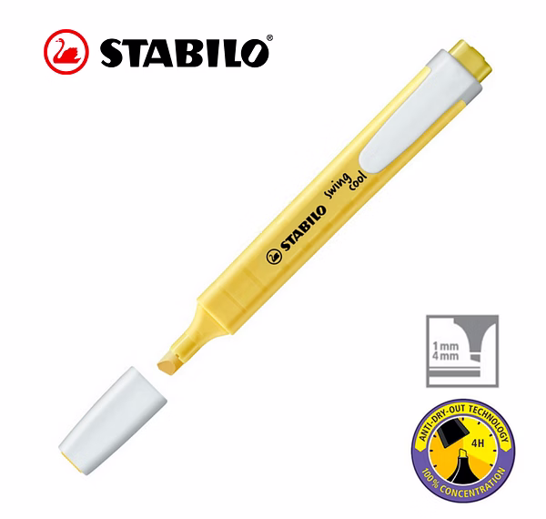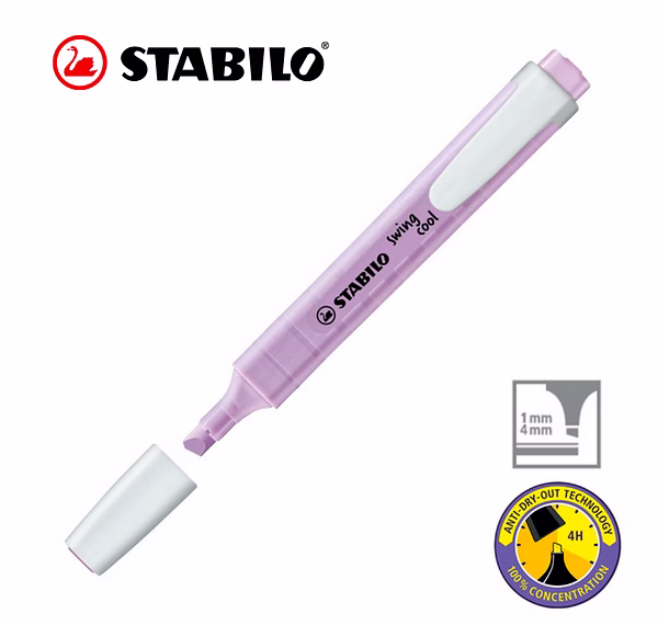 STABILO Anti-Dry-Out technology: 4 hours dry-out protection for concentrated work. Flat pocket-sized highlighter with a practical clip. STABILO swing cool Pastel out of their pocket can show off a practical and highly stylish accessory that will catch everyone’s eye. On paper and in their hand.