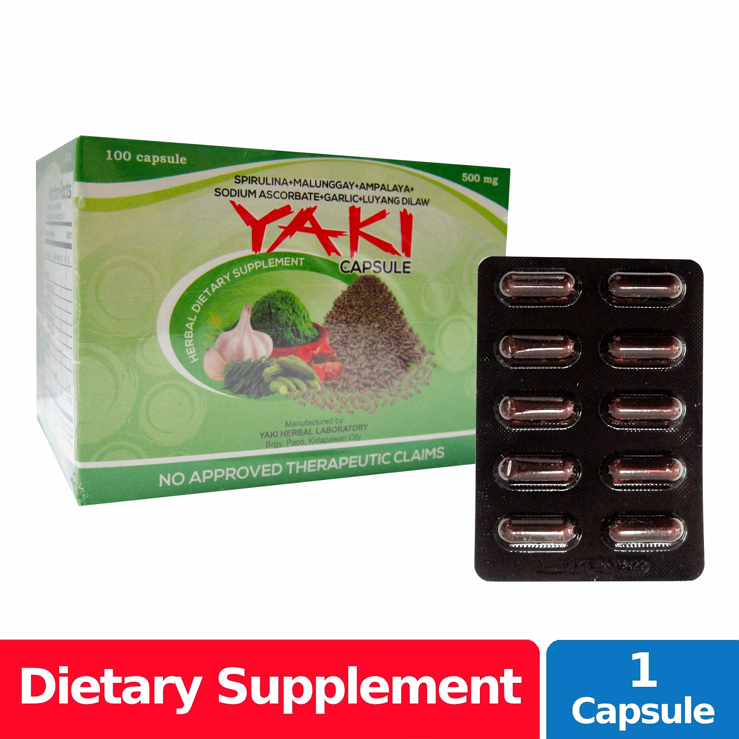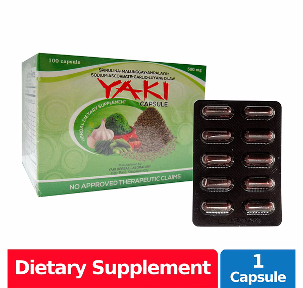 The Yaki herbal capsule contains spirulina, ampalaya, malunggay, sambong, and garlic. It is designed to promote cleansing of the organs and blood.